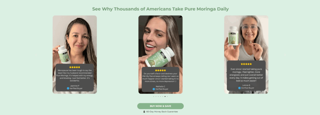 “Your order today is protected by our 180-Day 100% Money-Back Guarantee. If you are not completely satisfied with your experience using Pure Moringa, simply contact us within 180 days and we’ll refund every penny of your purchase. No questions asked.”